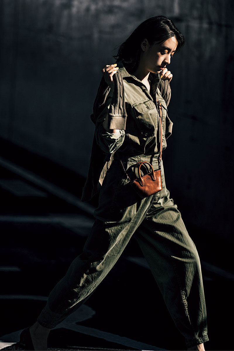 つなぎ風にまとめたカーキの上下に同色ニットでリズムをプラス