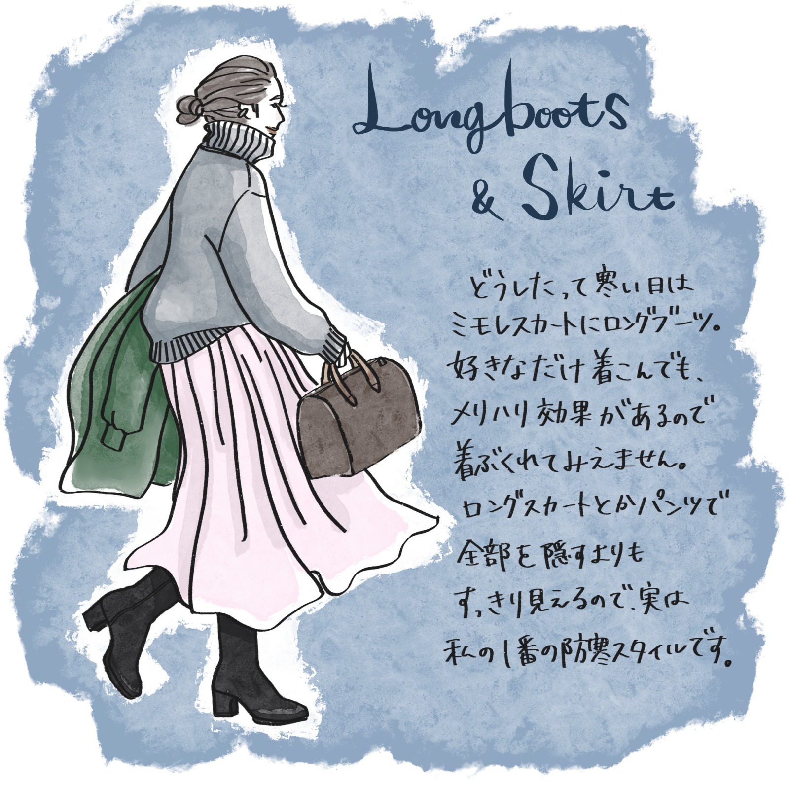 「どうしたって寒い日はミモレスカートにロングブーツ。好きなだけ着こんでも、メリハリ効果があるので着ぶくれてみえません。ロングスカートとかパンツで全部を隠すよりもすっきり見えるので、実は私の1番の防寒スタイルです」by.KURIO