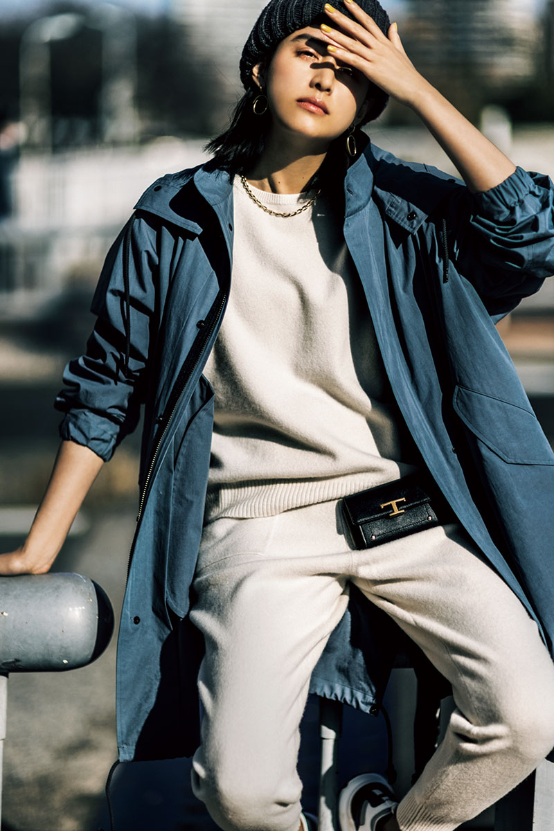 ニットのセットアップにモッズコートをラフに重ねて。クリーンな配色と快適な着心地が引き出すヘルシーな空気感がまさに気分。コート¥72,600(イレ―ヴ)ニット¥50,600パンツ¥53,900(ともにebure/ebure GINZA SIX店)バッグ¥80,300スニーカー¥97,900(ともにトッズ/トッズ・ジャパン)ニット帽¥6,380(CA4LA/CA4LAプレスルーム)ピアス¥283,800ネックレス¥220,000(ともにウノアエレ/ウノアエレ ジャパン)