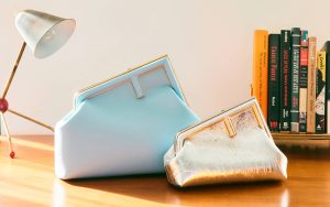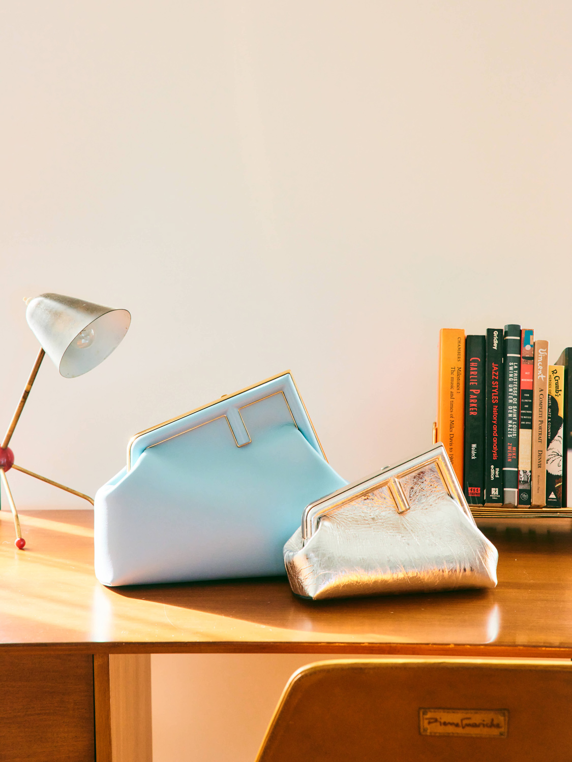 2021-2022秋冬ウィメンズコレクションで発表され、メゾンのアイコンバッグに仲間入りした「フェンディ ファースト」。ソフトなクラッチのフレームに、メゾンの頭文字“F”を斜めに配したデザインは、大胆かつ遊び心満点。今シーズンは、春の軽やかな着こなしにマッチするアイスブルーやシルバーがラインナップ。キレイめコーデに投入して、フェンディならではのひねりの効いた個性を引き立てて。