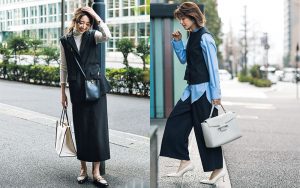 ジレ¥37,400スカート¥25,300(ともにウィム ガゼット/ウィム ガゼット ルミネ新宿店)ニット¥12,100(アルページュストーリー/アルページュストーリープレスルーム)ショルダーバッグ¥63,800(ザンケッティ/エリオポール代官山)トートバッグ¥15,400(ヤーキ/ヤーキ オンラインストア)シューズ¥30,800(カステラーノ/フラッパーズ)イヤリング¥9,180(アビステ)バングル¥9,460(フルオブグレイス/ZUTTOHOLIC)
