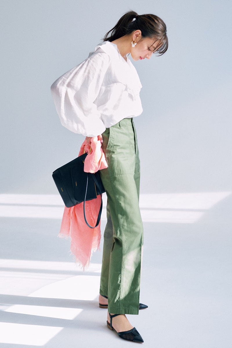 トップスを選ばず、大人のカジュアルをハンサムに引き上げる新ベーシックボトムス。パンツ¥17,600(ユナイテッドアローズ/ユナイテッドアローズ 有楽町店)ブラウス¥25,300(マルティニーク/マルティニーク ルコント ルミネ有楽町)バッグ¥38,500(オルセット/アッシュプラスエリオトロープ)ストール¥19,800(アソース メレ/アイネックス)サンダル¥57,200(ペリーコ/アマン)ピアス¥15,180(リリーズ/フォーティーン ショールーム)