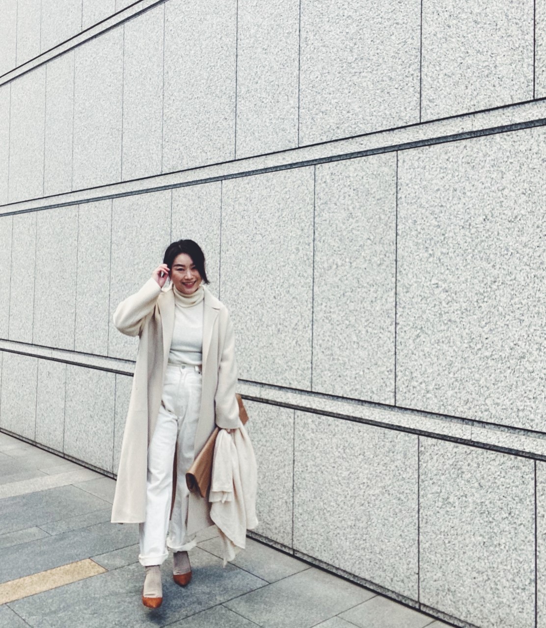 「オール白の着こなしは気分転換にもなるし、周りからも春らしいねと褒めてもらうことが多いです。白でもほっこりさせず、シャープな雰囲気で着たかったのでショート丈のコートとセンタープレス入りのパンツですっきりとまとめました。上半身をコンパクトすると、白でもスタイルアップして見える気がします」(ライター広田香奈さん)