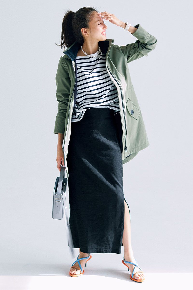 定番のボーダーカットソーに合わせるだけで、洗練モードな仕上がりに。ストレッチリネンに配された片スリットが、ごくシンプルな着こなしにほんの少しのスパイスを与えます。ブルゾン¥81,400(カナダグース)カットソー¥14,300(トラディショナル ウェザーウェア/トラディショナル ウェザーウェア青山店)スカート¥22,000(セピエ/ガリャルダガランテ表参道店)バッグ¥93,500(ボナベンチュラ)サンダル¥135,300(ピエール アルディ/ピエール アルディ東京)ネックレス¥17,600(インムード/フォーティーン ショールーム)時計¥10,450(ベイビージー/カシオ計算機お客様相談室)