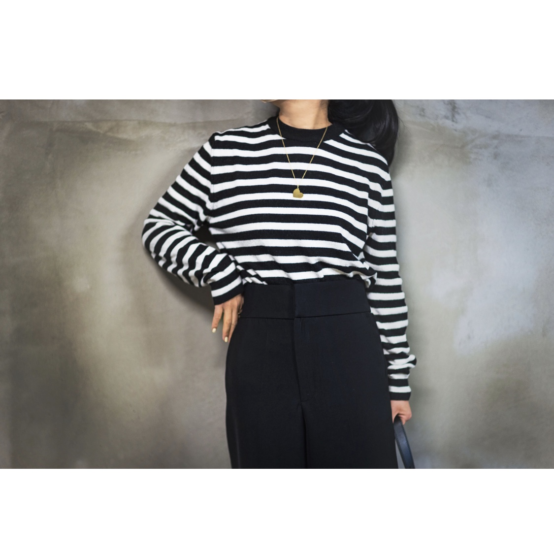 花ちゃんのコーディネートをマネして黒パンツを合わせてみましたが、自分的には、「お⁉ボーダーなのに、なんだかいつもより痩せて見える⁉」(あくまで当社比)とびっくり。ボーダー好きなのにたまに着られなくなるのは、ほっこり見えてしまうから。でもコレは黒白なのでむしろ都会的な印象なんです。