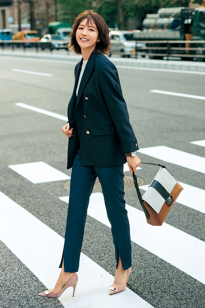 地味になりがちなお堅い通勤服こそ、トレンド感のあるスリットパンツで今っぽさと抜け感をプラスして、真面目すぎないバランスを意識。靴とバッグは女らしいものをアクセントに。パンツ【EC限定カラーネイビー】¥20,900(ル フィル/LE PHIL NEWoMan新宿店)ジャケット¥41,800(ルーニィ)ニット¥23,100(スローン)バッグ¥70,400(FURLA/FURLA JAPAN)パンプス¥108,900(セルジオ ロッシ/セルジオ ロッシ カスタマーサービス)ネックレス¥17,710(ジゼルベー/ZUTTOHOLIC)ダイヤネックレス¥46,200(ココシュニック)時計¥21,890(クルース/HIROB ルミネ新宿店)