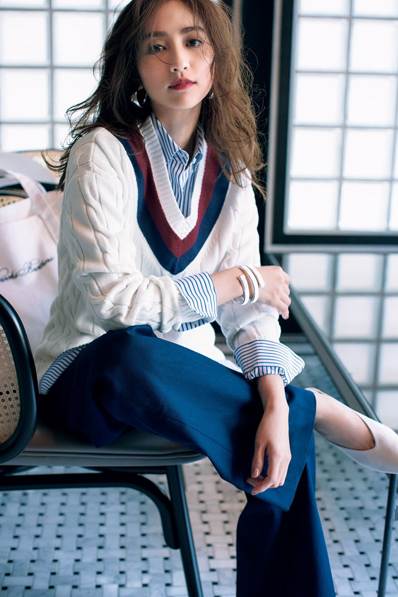 ライン入りの深いVネックセーターは春の注目アイテム。シャツ×パンツのきちんとコーデにプラスするだけで、よりヘルシーな女らしさが際立ちます。 セーター¥19,800シャツ¥15,400パンツ¥31,900バッグ¥12,100(すべてブルックス ブラザーズ/ブルックス ブラザーズ ジャパン)シューズ¥35,200(ファビオ ルスコーニ/ファビオ ルスコーニ ルミネ有楽町店)ピアス¥11,000バングル¥17,600(ともにワンエーアールバイウノアエレ/ウノアエレ ジャパン)