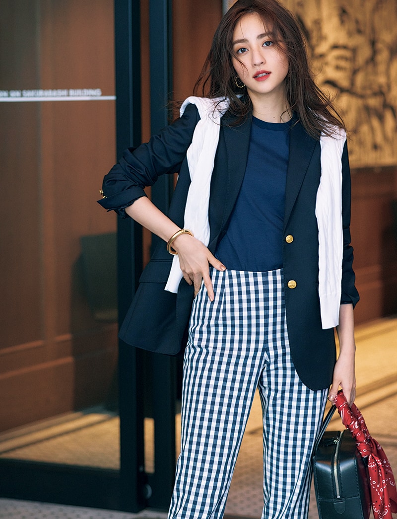 気負わずに羽織れるシングルの金ボタンジャケット。Tシャツもギンガムチェックのパンツもネイビーでまとめたワントーンの着こなしで、フレッシュなムードに。 ジャケット¥81,400Tシャツ¥8,800パンツ¥24,200肩にかけたニット¥16,500(すべてブルックス ブラザーズ/ブルックス ブラザーズジャパン)バッグ¥71,500(メゾン カナウ/ヤマニ)バッグに巻いたスカーフ¥17,600(マニプリ)ピアス¥14,300バングル¥9,350(ともにワンエーアールバイウノアエレ/ウノアエレ ジャパン)