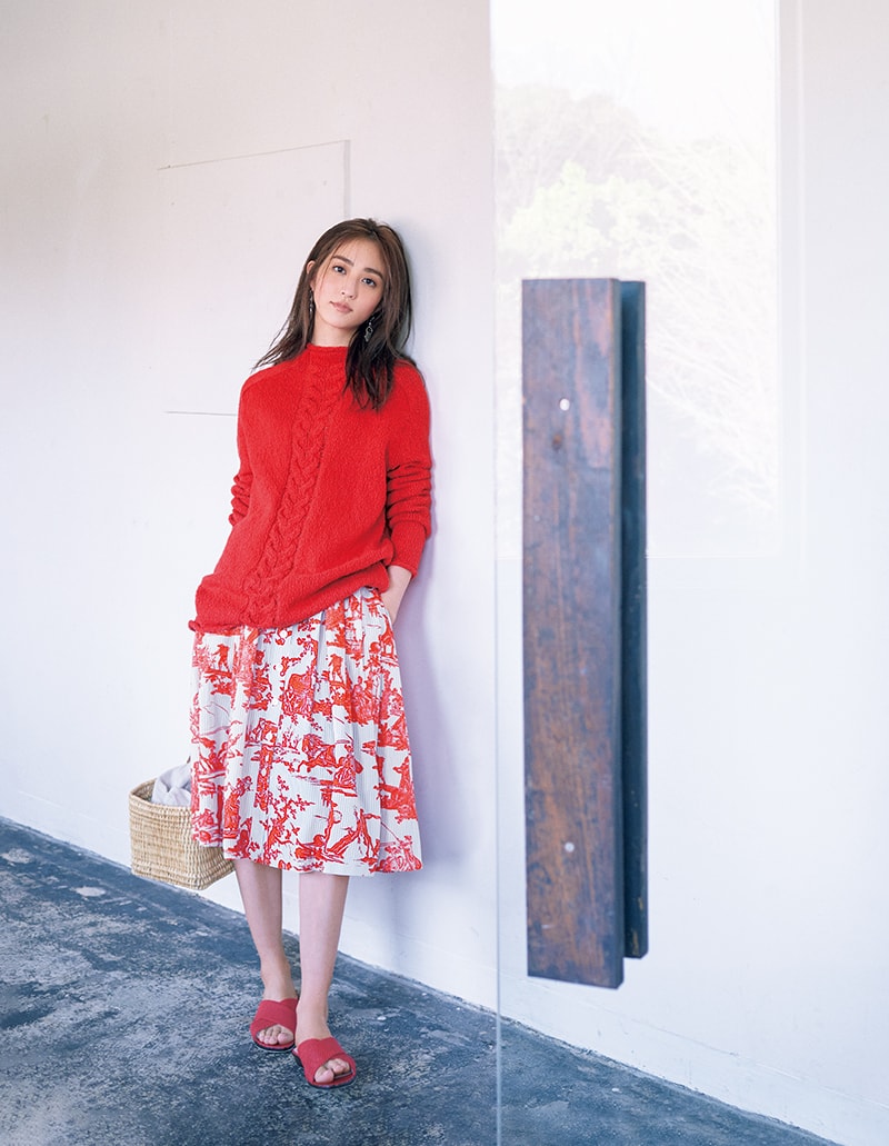 〝トワルドジュイ〟(フランスの伝統的なデザイン、生地のこと)が目を引くひざ下丈のフレアスカート。プリントとリンクさせた赤のサマーニットでコーディネート感を高め、印象的な装いに。 ニット¥22,000スカート¥24,200(ともにブルックス ブラザーズ/ブルックス ブラザーズ ジャパン)バッグ¥9,900(ケッシュ ル エッセンシャル)サンダル¥53,900(ネブローニ/フラッパーズ)ストール¥31,900(スロー)ピアス¥13,200(アダワットトゥアレグ)
