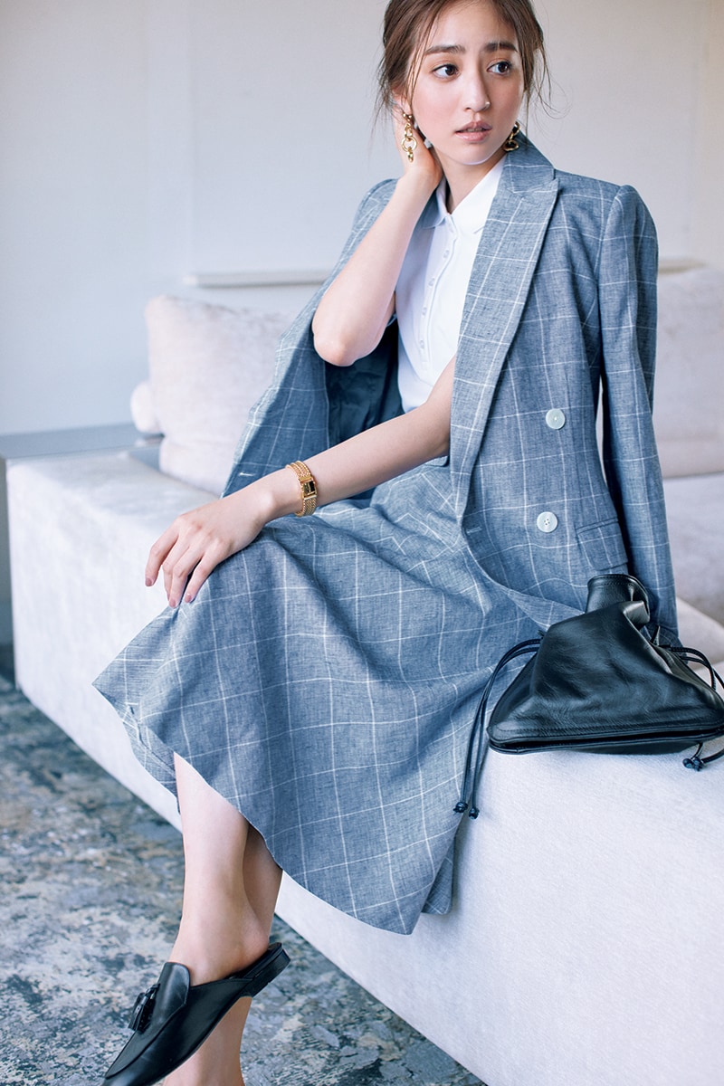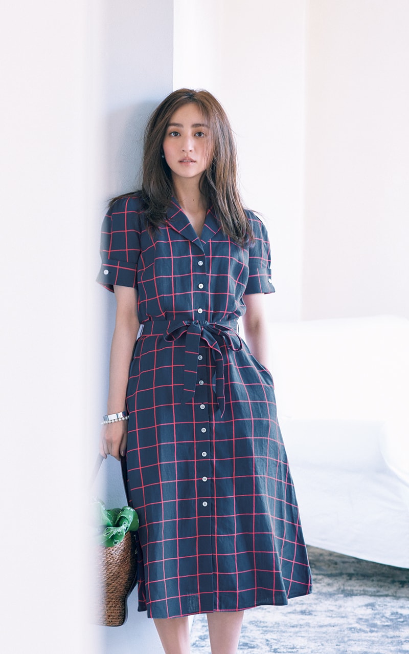 春夏シーズンにぴったりな格子柄のワンピース。ドライブやデート、ショッピング…あらゆるシーンになじむ、オールマイティな一枚。オーバーシルエットの服では手に入らない、上品オーラが自慢です。 ワンピース¥31,900(ブルックス ブラザーズ/ブルックス ブラザーズ ジャパン)バッグ¥23,100(マルシェ/フラッパーズ)スカーフ¥12,100(マニプリ)ピアス¥9,450ブレスレット¥10,290バングル¥8,640(すべてアビステ)