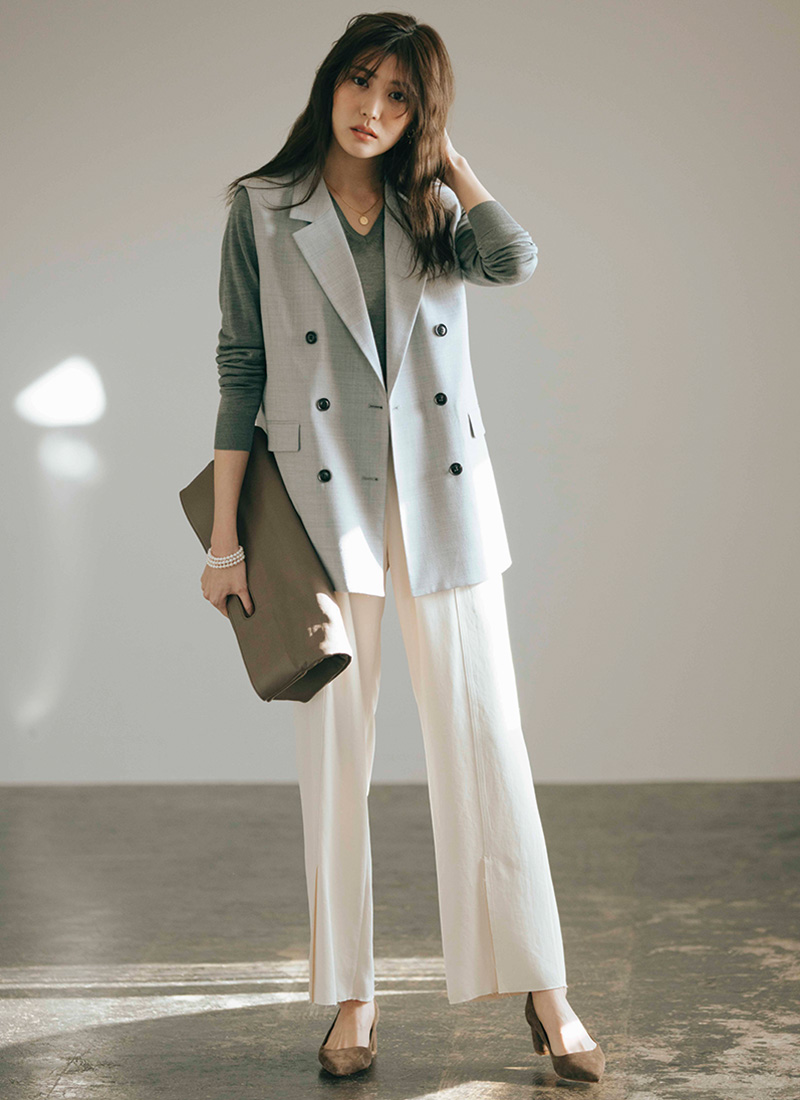 ジレと同系色のニット&センタープレス入りのワイドパンツを合わせれば、最強の着やせコーデが完成!ジレ¥25,300(アダム エ ロペ)ニット¥31,900(スローン)パンツ¥28,600(ロンハーマン/ロンハーマン)バッグ¥53,900(MODERN WEAVING/ショールーム セッション)パンプス¥28,600(ツル バイ マリコ オイカワ)ピアス¥2,400(ヘンカ/ロードス)ネックレス¥6,930(ベンアムン/ZUTTO HOLIC)ブレスレット¥49,500(アルティーダ ウード)
