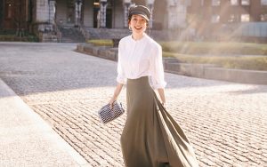 シャツ¥19,800(ブルックス ブラザーズ/ブルックス ブラザーズ ジャパン)スカート¥39,600(エイトン/エイトン青山)バッグ¥59,400(ピエール アルディ/ピエール アルディ 東京)シューズ¥130,900(ジェイエムウエストン/ジェイエムウエストン 青山店)キャスケット¥20,900(CA4LA/CA4LA プレスルーム)ピアス¥14,300バングル¥16,500(ともにワンエーアールバイウノアエレ/ウノアエレ ジャパン)