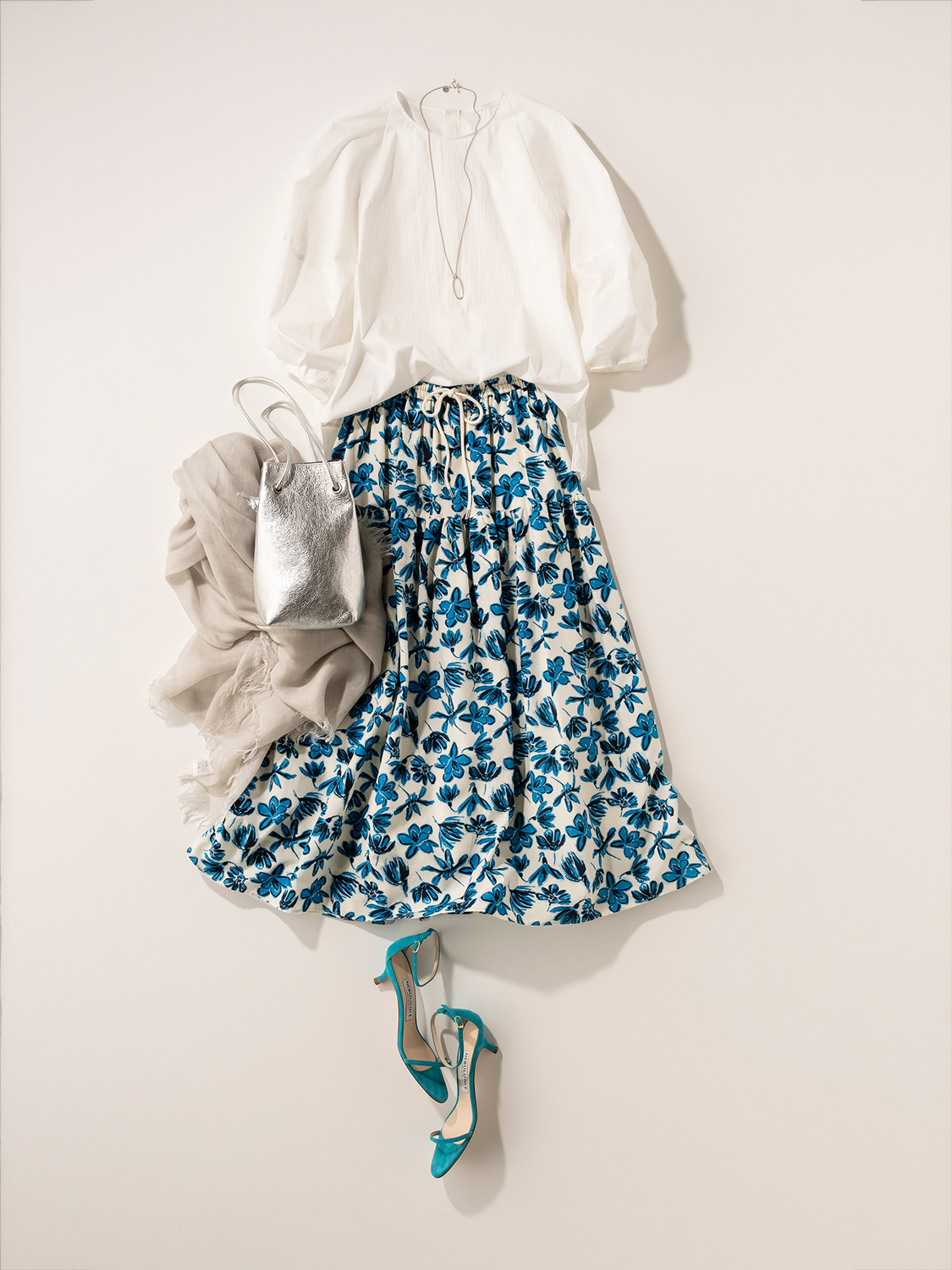 鮮やかなブルーのフラワープリントとティアードシルエットのボリュームが効いたスカートで、シンプルトップスを合わせたワン・ツーコーデをリッチに導いて。甘さ控えめな白×ブルーの配色で大人の可愛さが叶うのも褒められポイント。今年らしい盛り袖ブラウスと一緒にキレイめにアレンジすれば、女らしさも華やかさも一挙両得。