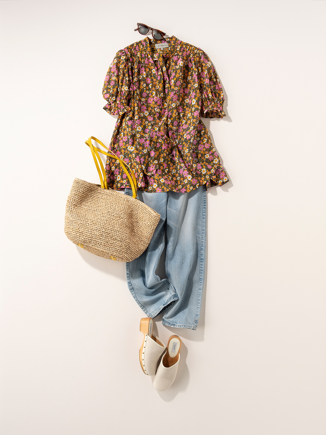華やかなフラワープリント、ふんわりスリーブ、シャーリングディテールと女心くすぐるデザインが盛り込まれたブラウス。リラックス感のあるフレアシルエットだから、さらっと1枚着るだけで気張らない可愛さ手に入り、褒められ度も急上昇。定番のブルーデニムを合わせれば、ヘルシーで女らしいカジュアルに着地。