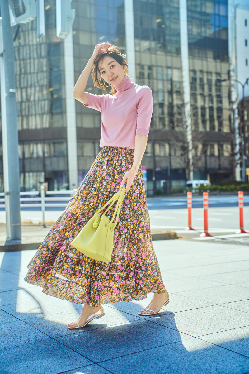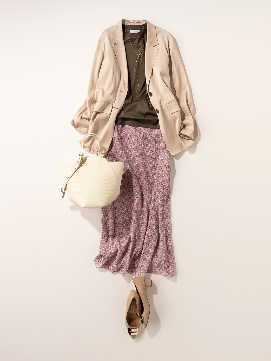 小花柄とIシルエットで甘すぎないから、「花柄も大人っぽく着たい」というCLASSY.世代も取り入れやすい1枚。キレイめジャケットを相棒にきちんと感を高めれば、お仕事シーンにもマッチして、つい地味にまとまりがちな通勤コーデのリフレッシュにも一役。カットソーやロゴT合わせならカジュアルにもアレンジできて、着回し力も兼備。