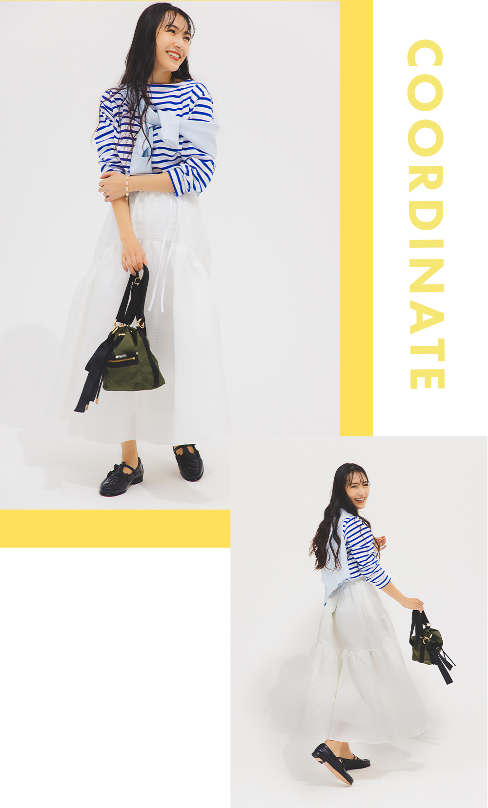 カーキが重く見えないよう、爽やか配色のコーディネートと合わせて軽やかに。女性らしい雰囲気にあえてカジュアル素材のバッグを一点投入すれば、今っぽい余裕のある着こなしが叶います。バッグ¥19,800〈H23×W25×D11cm〉(ランバン オン ブルー/レリアン)トップス¥11,880(セントジェームス/セントジェームス代官山店)肩にかけたニット¥6,990(プラステ)スカート¥27,500(BLUELEA)ブレスレット¥13,200(フォークバイエヌ/UTS PR)シューズ¥33,000(カステラーノ/フラッパーズ)