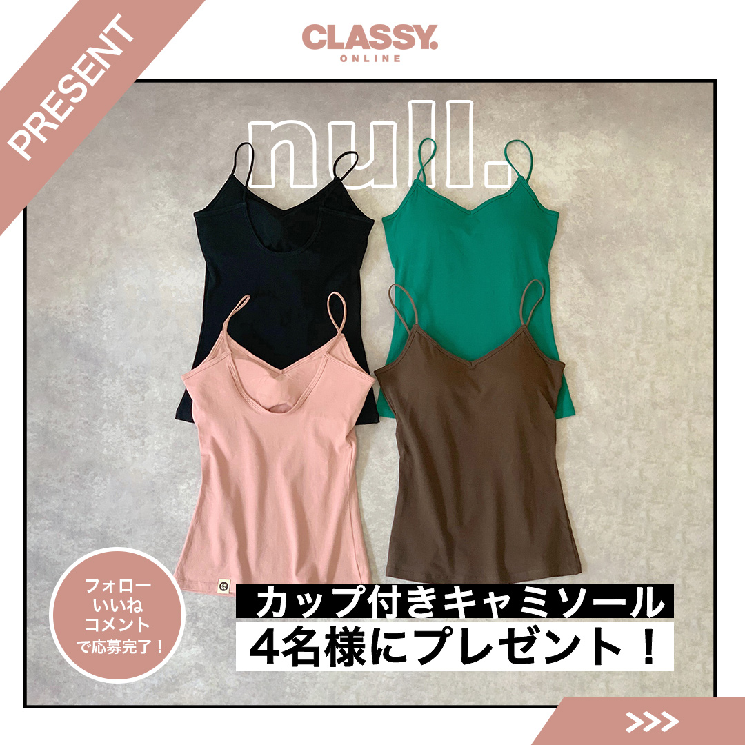 なんと今回、null.の「ナローストラップカップ付きキャミソール」から、「ダークグリーン」、「ピンク」、「ダークブラウン」、「ブラウン」の各4色を、それぞれ4名様にプレゼント!CLASSY.の公式インスタグラムにて簡単に応募できるので、ぜひチェックしてくださいね。