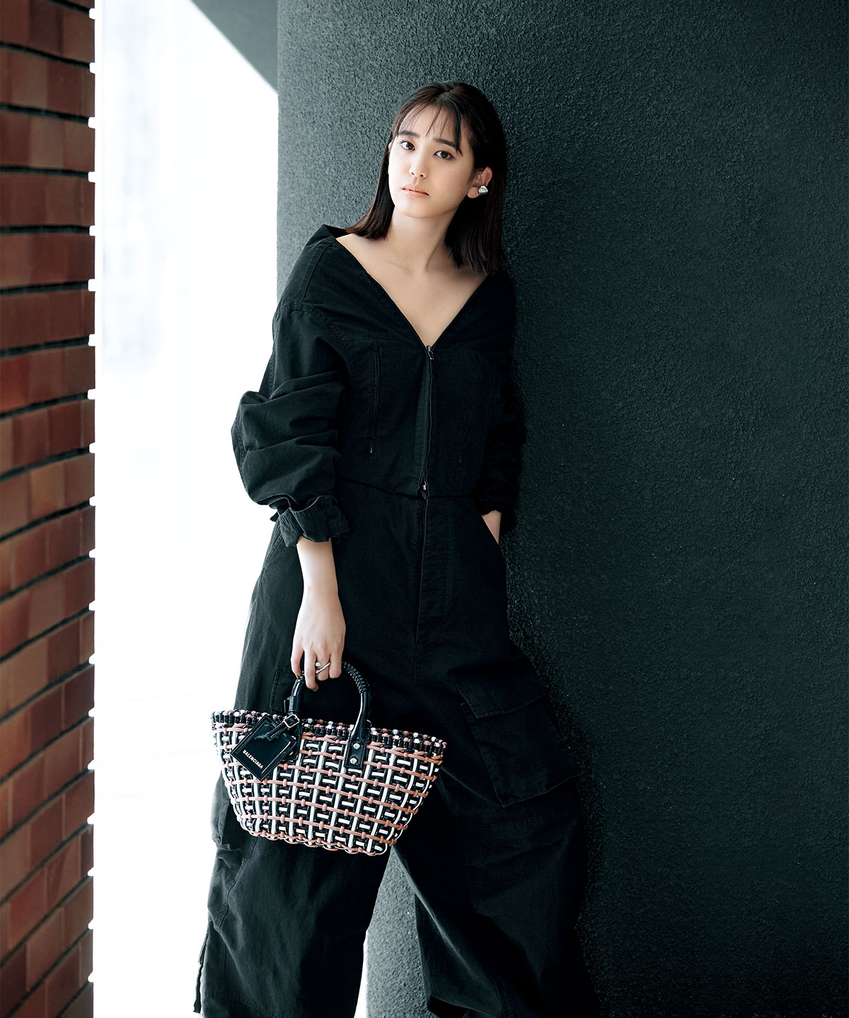 バッグ「ビストロ XS バスケット」[日本限定カラー/取り外し可能なストラップ付き]〈H21×W41×D13㎝〉¥85,800オールインワンとしても着用できるカーゴパンツ¥306,900イヤカフ¥41,800[参考価格]リング[参考カラー]¥74,800(すべてバレンシアガ/バレンシアガ クライアントサービス)