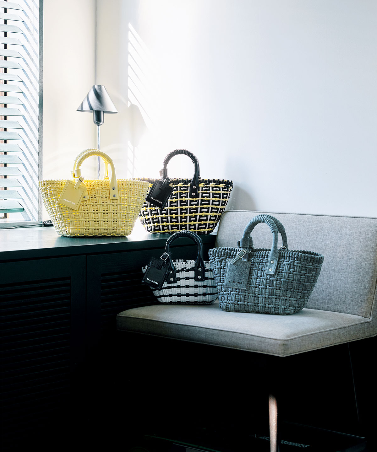 [上段]バッグ「ビストロ XS バスケット」〈H21×W41×D13㎝〉各¥85,800[下段右から]バッグ「ビストロ XS バスケット」〈H21×W41×D13㎝〉¥99,000、「ビストロ XXS バスケット」〈H14×W28×D15㎝〉¥74,800[すべて取り外し可能なストラップ付き](すべてバレンシアガ/バレンシアガ クライアントサービス)