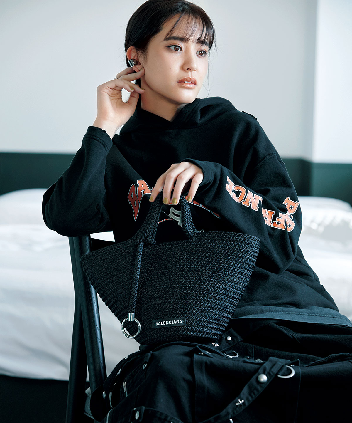 バッグ「イビザ S バスケット][取り外し可能なストラップ付き]〈H18×W34.5×D15㎝〉¥104,500※4月上旬以降発売予定 フーディ¥119,900 Tシャツ[参考商品]スカート¥484,000イヤカフ¥41,800[参考価格]リング[参考カラー]¥74,800(すべてバレンシアガ/バレンシアガ クライアントサービス)