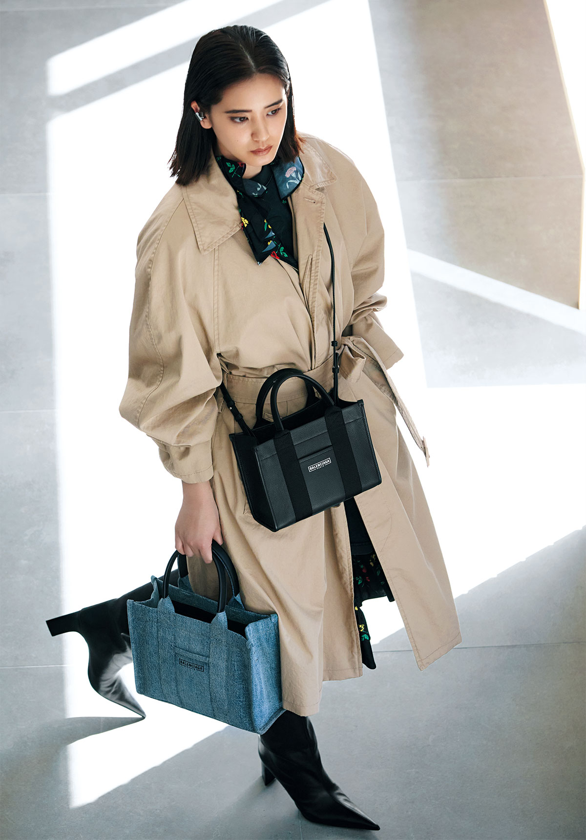斜め掛けにしたバッグ「ハードウェア XS トート」〈H18×W23×D9㎝〉¥143,000手に持ったバッグ「ハードウェア S トート」[取り外し可能なストラップ付き]〈H21×W27×D11㎝〉¥134,200リバーシブルトレンチ¥612,700 Tシャツ[参考商品]イヤカフ¥41,800[参考価格]ブーツ〈ヒール9㎝〉¥240,900(すべてバレンシアガ/バレンシアガ クライアントサービス)