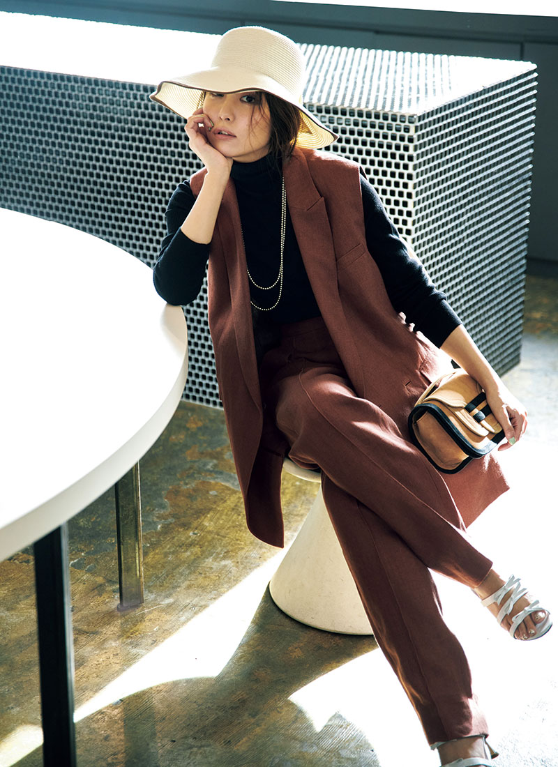 気負いなく取り入れられるヒップ下丈のジレとテーパードパンツの組合せ。甘いハットとサンダルでドラマチックな味付けを。ジレ¥67,100パンツ¥47,300〈ともにエブール フォーロンハーマン〉ネックレス¥46,200〈インディアンジュエリー〉(すべてロンハーマン)ニット¥22,000(フロム)バッグ¥135,300(ピエールアルディ/ピエール アルディ東京)サンダル¥134,200(マノロ ブラニク/ユナイテッドアローズ有楽町店)帽子¥18,150(CA4LA/CA4LAプレスルーム)