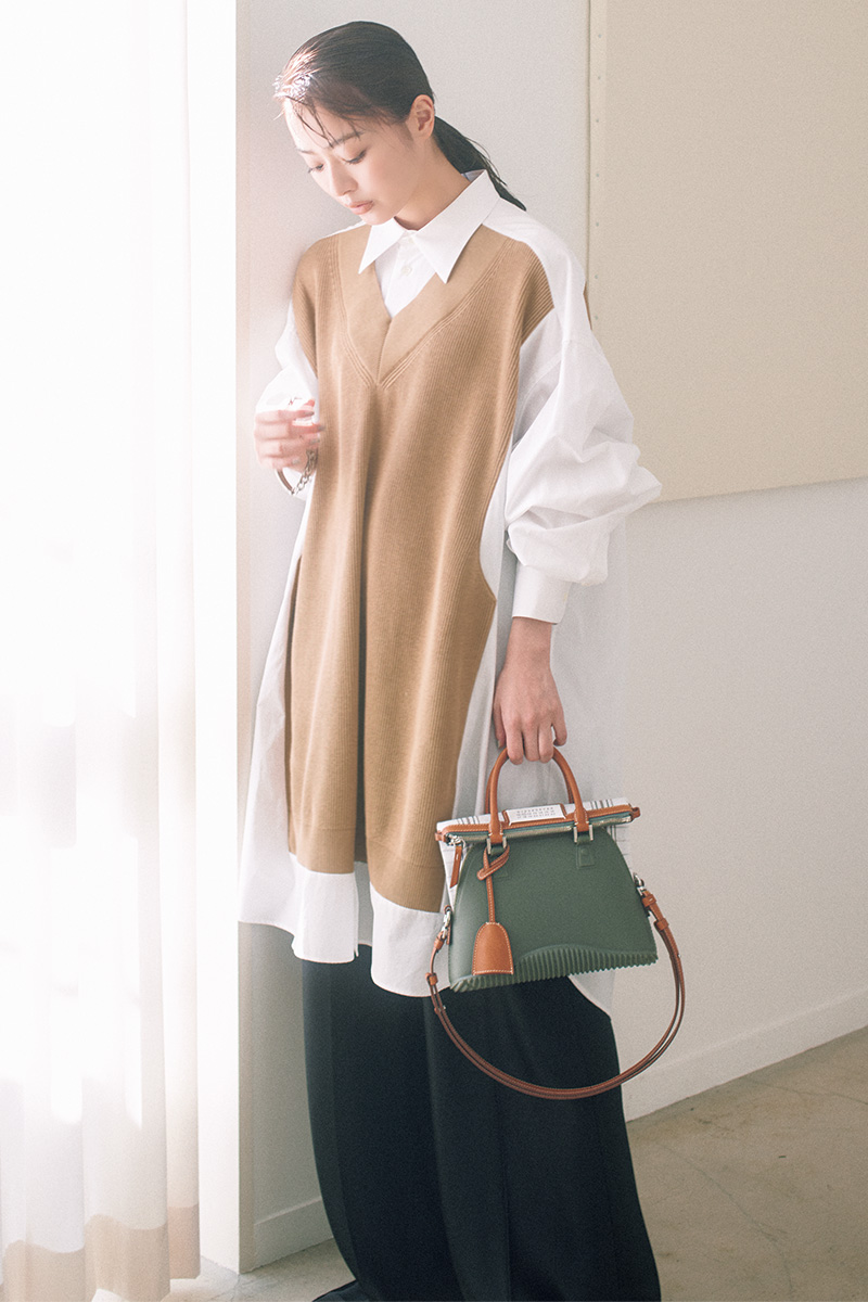 バッグ「5AC」ミニ〈H17.5×W25.5×D8㎝〉¥216,700 シャツ¥170,500 パンツ¥181,500 ブレスレット¥124,300(すべてメゾン マルジェラ/マルジェラ ジャパン クライアントサービス)