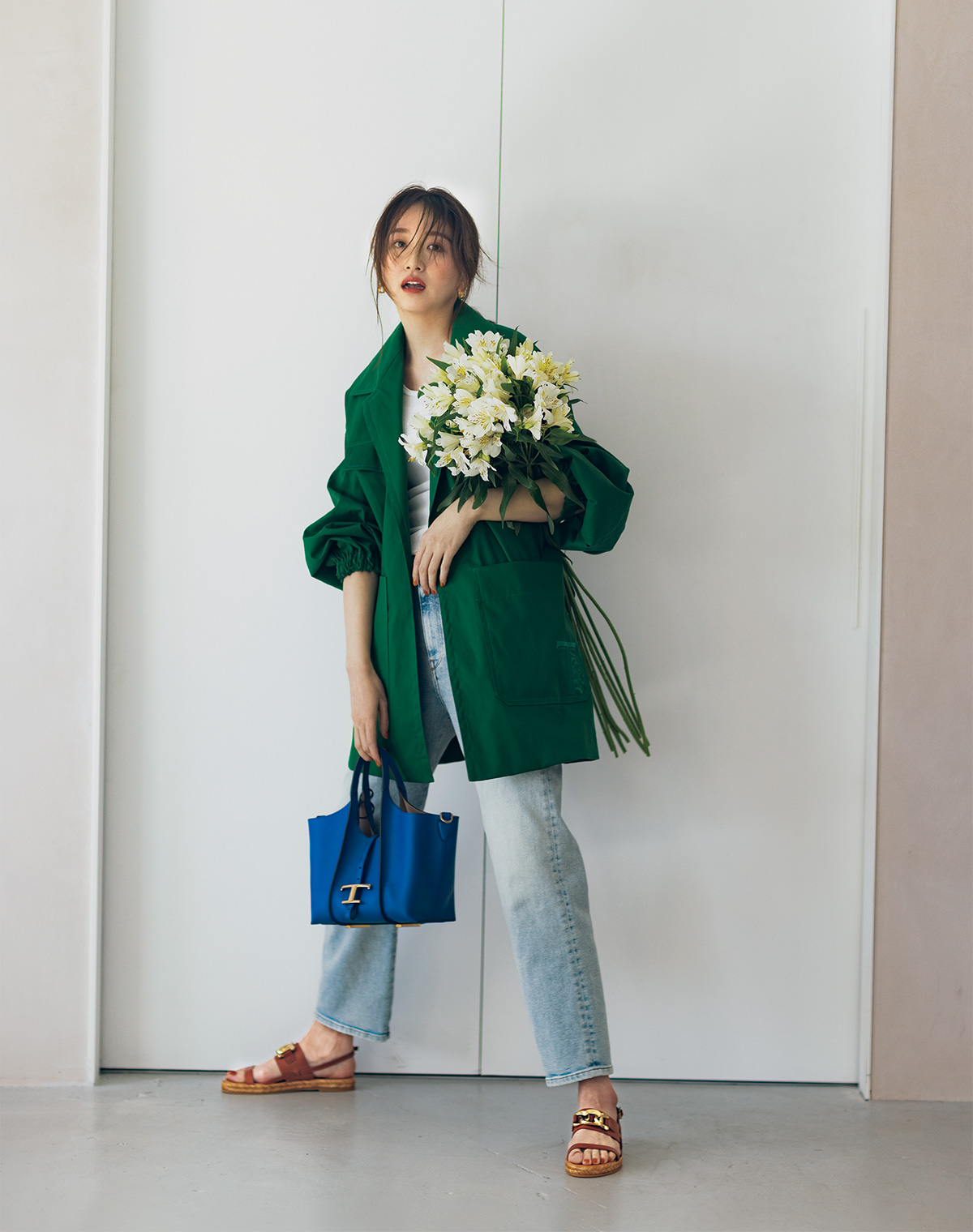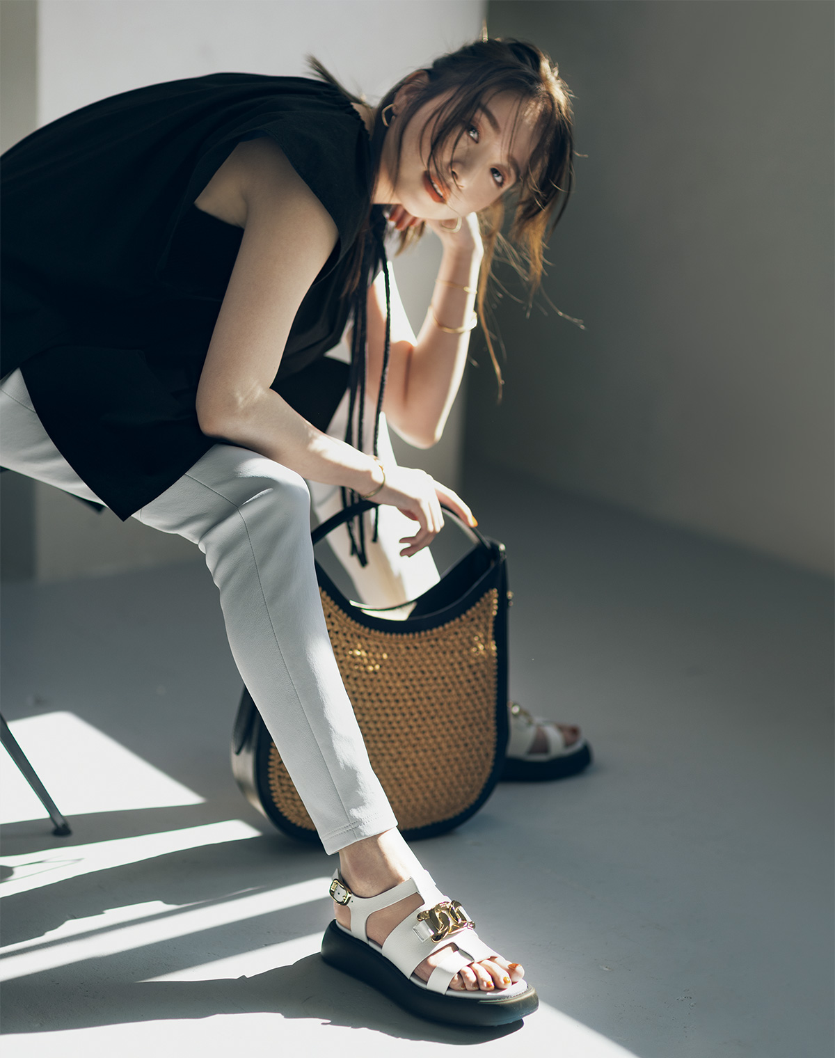 サンダル[H0.7㎝]¥89,100バッグ[W23×H19.5×D12]¥185,900コート¥207,900(すべてトッズ/トッズ・ジャパン)タンクトップ〈2枚組〉¥1,980(ヘインズ/ヘインズブランズ ジャパン カスタマーセンター)デニム¥46,200(ディーゼル/ディーゼル ジャパン)ピアス¥91,300(ウノアエレ/ウノアエレ ジャパン)