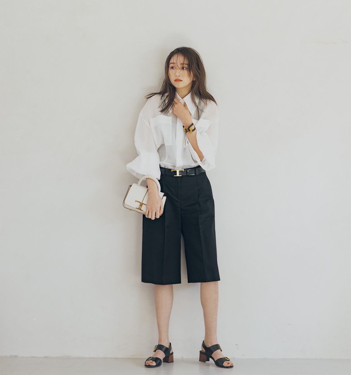 サンダル[H4.5㎝]¥94,600バッグ[W21×H15×D10]¥262,900ハーフパンツ参考商品ベルト¥68,200バングル¥53,900(すべてトッズ/トッズ・ジャパン)ブラウス¥46,200(COATE FUKUYA CHIHARU DESIGN)