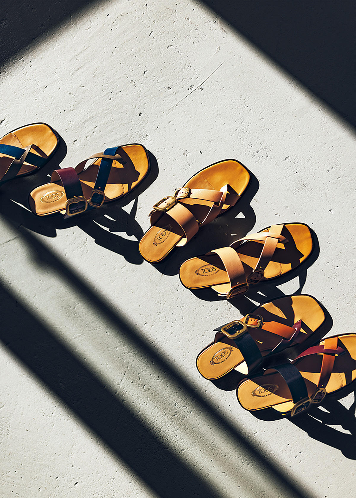 ラフになりがちな素足の季節も清潔感はキープしたい。そんな気持ちに応えてくれる、TOD’Sのきれいめサンダルは心強い味方。普段のきれいめ服に馴染んで、カジュアルな服も自分らしいバランスで着られます。