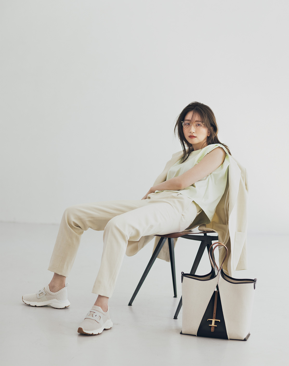スニーカー[H4㎝]¥91,300バッグ[W34×H29×D14]¥185,900(ともにトッズ/トッズ・ジャパン)ジャケット¥129,800カットソー¥19,800パンツ¥68,200(すべてCOATE FUKUYA CHIHARU DESIGN)メガネ¥37,400(ワンスリー コンパウンド フレーム/デュアル)