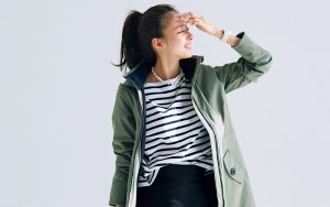 ブルゾン¥81,400(カナダグース)カットソー¥14,300(トラディショナル ウェザーウェア/トラディショナル ウェザーウェア 青山店)スカート¥22,000(セピエ/ガリャルダ ガランテ 表参道店)バッグ¥93,500(ボナベンチュラ)サンダル¥135,300(ピエール アルディ/ピエール アルディ 東京)ネックレス¥17,600(イン ムード/フォーティーン ショールーム)時計¥10,450(ベイビー ジー/カシオ計算機お客様相談室)
