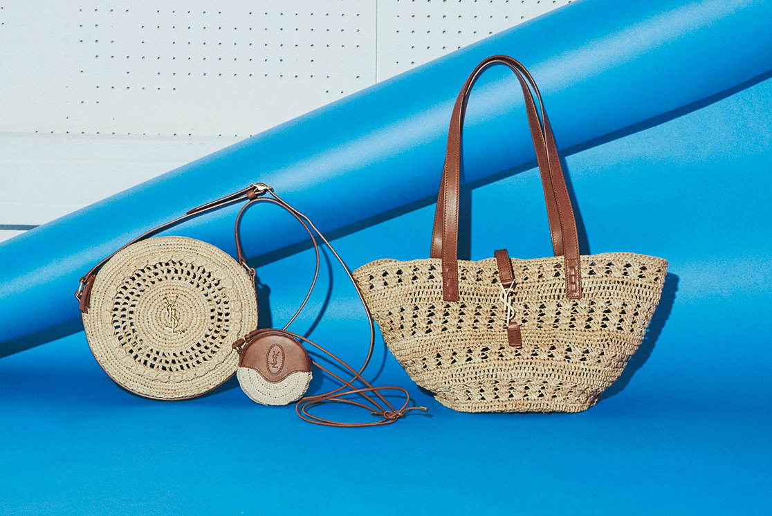 クチュールのクロシェのテクニックで編まれたラフィアを使用したホーボーバッグ。使い勝手のいい長めのショルダーストラップにメタルのYSLロゴのフッククロージャーが上品なアクセント。バッグ「ホーボー」〈H37×W30×D14㎝〉¥185,900ジャケット¥308,000Tシャツ¥55,000パンツ¥115,500サンダル¥176,000ピアス¥99,000バングル¥121,000(すべてサンローラン バイ アンソニー・ヴァカレロ/サンローラン クライアントサービス)