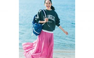 ロゴスウェット¥26,400(アニン・ビン/THIRD MAGAZINE)ロングスリーブTシャツ¥16,500(エイトン/エイトン青山)スカート¥45,100(シーピーシェイズ フォーロンハーマン/ロンハーマン)ピアス¥107,800ネックレス¥47,300リング¥234,300(すべてマリハ)スニーカー¥37,400(デイト×デミルクス ビームス/ビームス ハウス 丸の内)バックパック¥20,900(エパーソン マウンテニアリング/RHC ロンハーマン)
