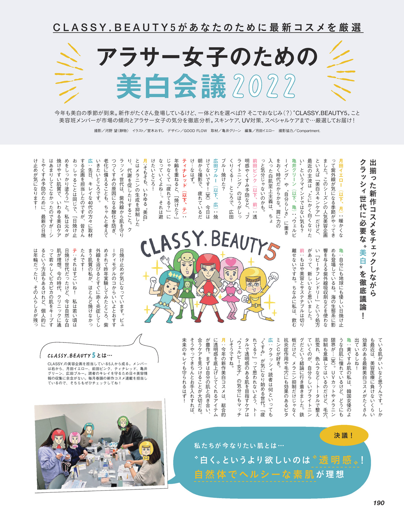 CLASSY.編集部の美容担当編集、美容担当ライターを集めたBEAUTY5。巻頭のコラムでも連載していますが、今月は今が旬、美白について語っています。