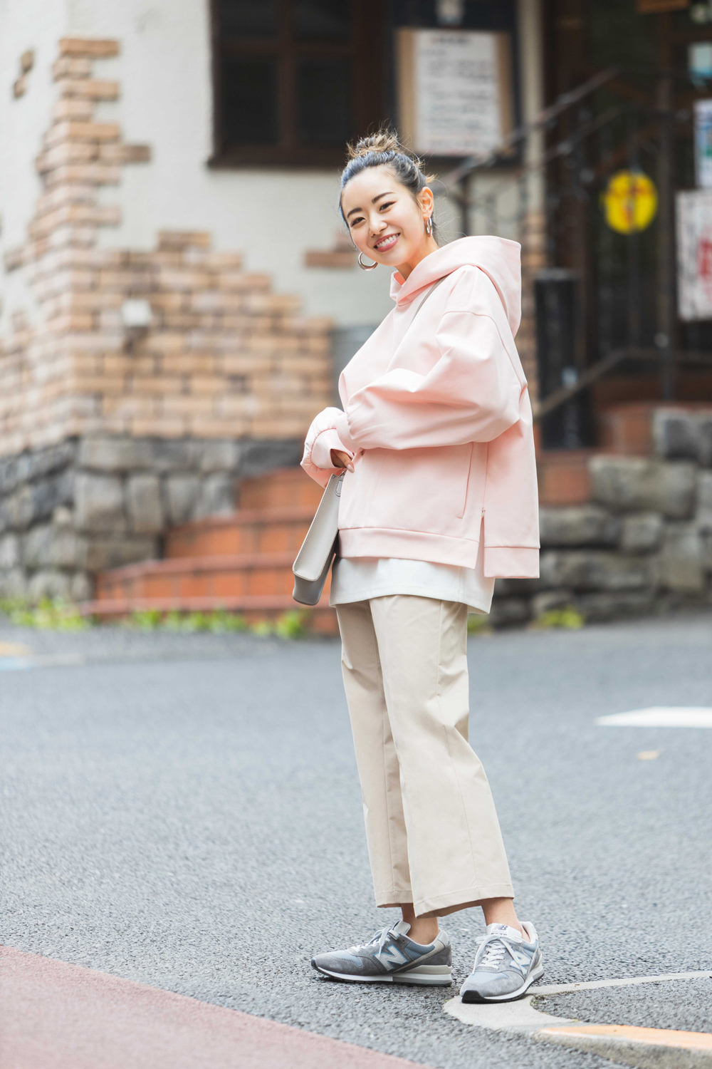 フーディ¥12,100カットソー¥9,900パンツ¥14,300スニーカー「CM996CB2」¥15,180(すべてニューバランス/ニューバランスジャパンお客様相談室)バッグ¥3,630(カシュカシュ/アンビリオン)ピアス¥5,250ブレスレット¥18,900(ともにアビステ)