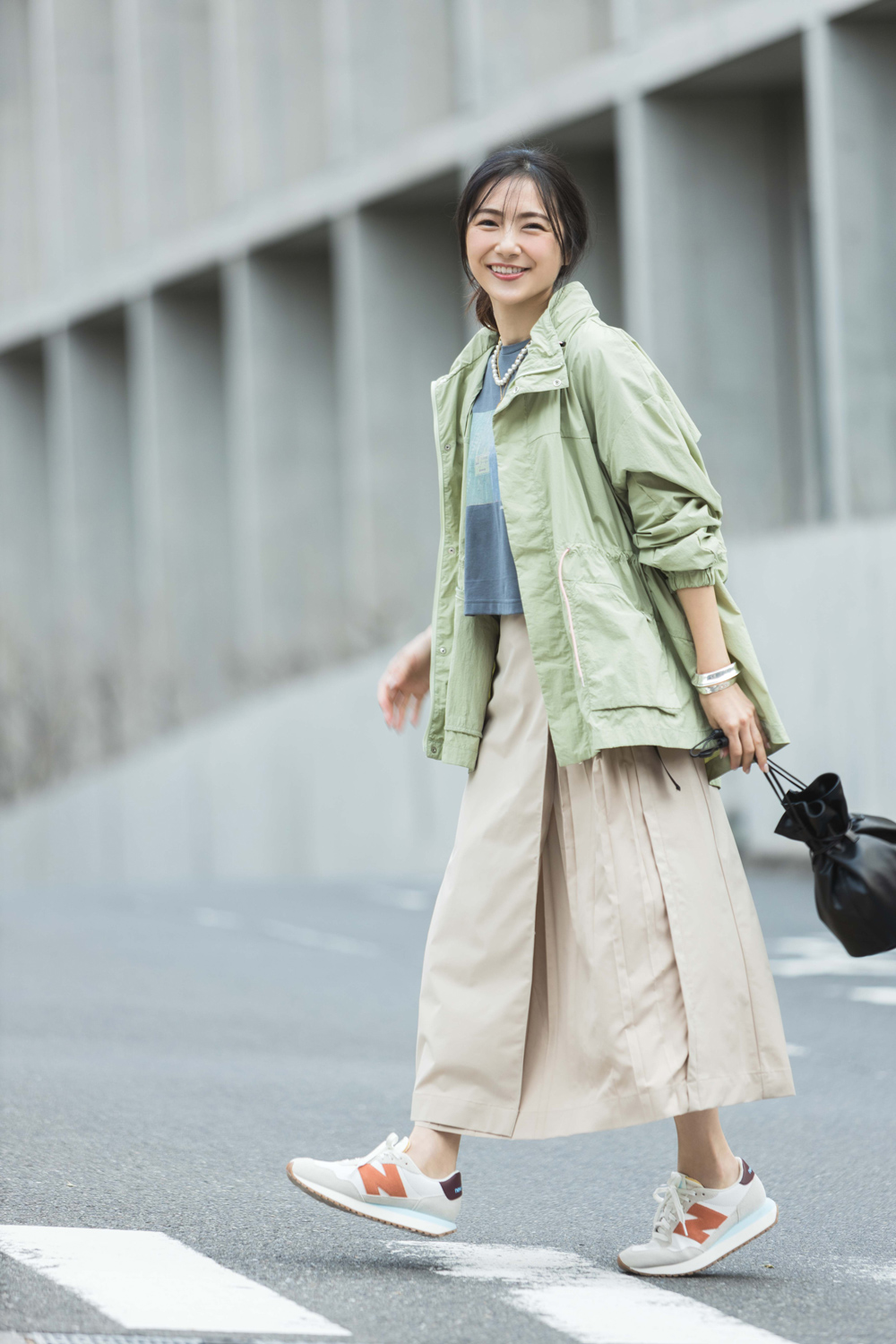 マウンテンパーカ¥22,000スカート¥14,300スニーカー「WS237BA」¥10,340(すべてニューバランス/ニューバランスジャパンお客様相談室)カットソー¥8,690(マイストラーダ)バッグ¥8,800(カカトゥ/アンビリオン)パールネックレス¥22,050コインネックレス¥9,900(チビジュエルズ/チビジュエルズ・ジャパン)バングル¥36,300(パズコレクティブ/ZUTTOHOLIC)