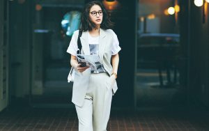 パンツの後ろ側、ふくらはぎ辺りにはギャザーがあしらわれていて後ろ姿も抜かりなく。フォトTを合わせて、リラックス感のある今どきオフィカジスタイルに仕上げて。ジレ¥35,200パンツ¥24,200〈ともにエストネーション〉Tシャツ¥14,300〈ザ インターナショナル イメージ コレクション〉ローファー¥47,300〈ピッピシック フォーエストネーション〉バッグ¥39,600〈オルセット〉(すべてエストネーション)眼鏡¥28,600(アイヴァン/アイヴァン東京ギャラリー)バングル¥41,800(シンパシーオブ ソウル スタイル/フラッパーズ)