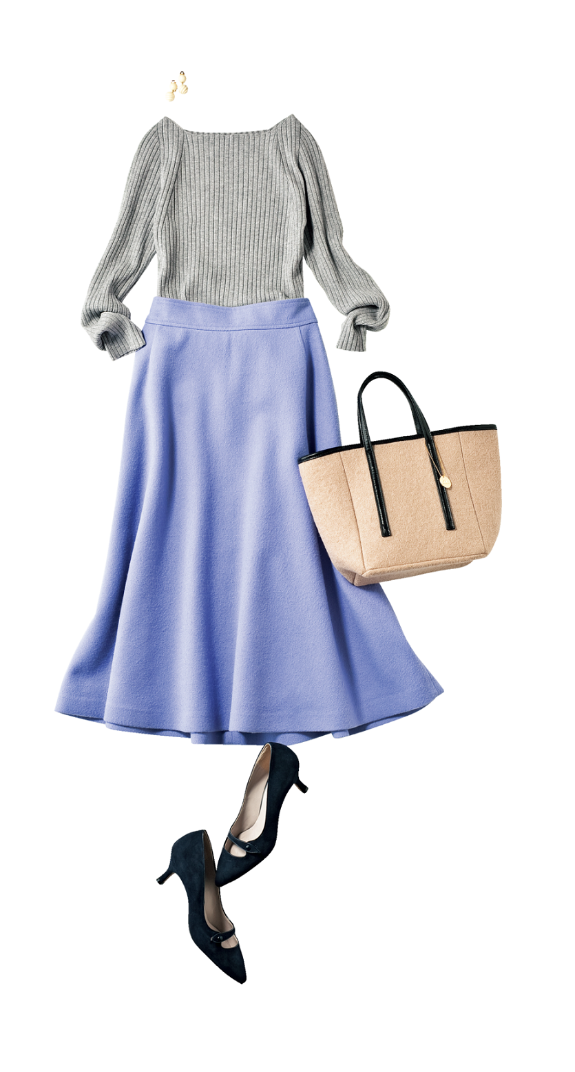 「明るいトーンでまとめると全体の雰囲気が優しくなります。彼の実家に伺うならジャケットやブラウスより、かっちりしすぎないニットがお勧め。女性らしいフレアスカートを合わせることで、可愛らしい印象に。座ったときに膝が出ない丈だと安心です」ニット¥8,900(イプセ)スカート¥24,000(ミミ&ロジャー)バッグ¥4,500(アネモネ/サンポークリエイト)パンプス¥18,000(オデット エ オディール/オデット エ オディール 新宿店)イヤリング¥6,250(アビステ)