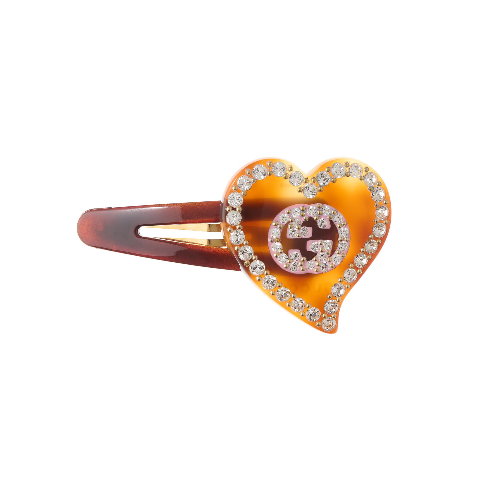 ぱちん!と留めるだけ。ヘアの長さ問わず&手間要らずに使えるヘアクリップ。インターロッキングGとクリスタルで彩られ、キラっと輝くハートモチーフがキュート! グッチの世界観を堪能できる仕上がりです。