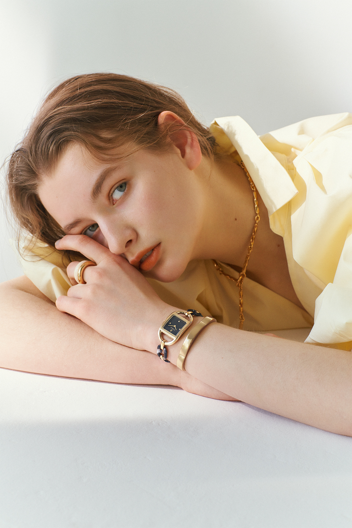 ブラックの文字盤にイエローゴールドカラーのケース、ブラックのべっ甲柄アセテートのチェーンを組み合わせたウォッチは、トレンドのボリューミーなゴールドジュエリーを合わせて、モード感たっぷり仕上げるのが今の気分です。