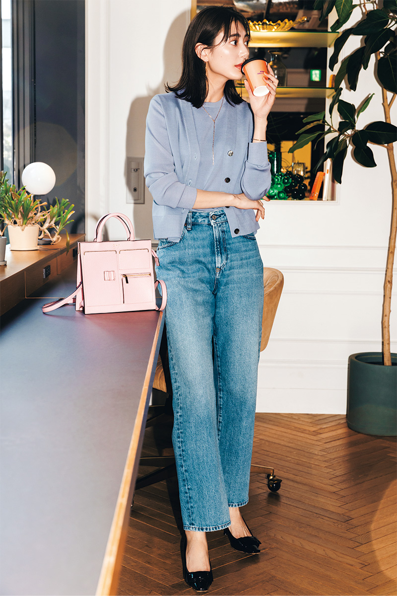 ウォッシュドデニムも品のいい色落ちであればオフィスにもなじみます。ツインニットなど上品トップスを選べばお仕事仕様に。コンサバなパンプスもちょうどいい調整役に。デニム¥31,900(ディーゼル/ディーゼル ジャパン)カーディガン¥35,200ニット¥25,300(ともにebure/ebure GINZA SIX店)バッグ¥49,500(オーエーディーニューヨーク/ショールーム セッション)パンプス¥108,900(セルジオ ロッシ/セルジオ ロッシ カスタマーサービス)ピアス¥38,500バングル¥37,400(ともにヴァンドーム青山/ヴァンドーム青山 プルミエール伊勢丹新宿店)ネックレス¥72,600(ココシュニック)
