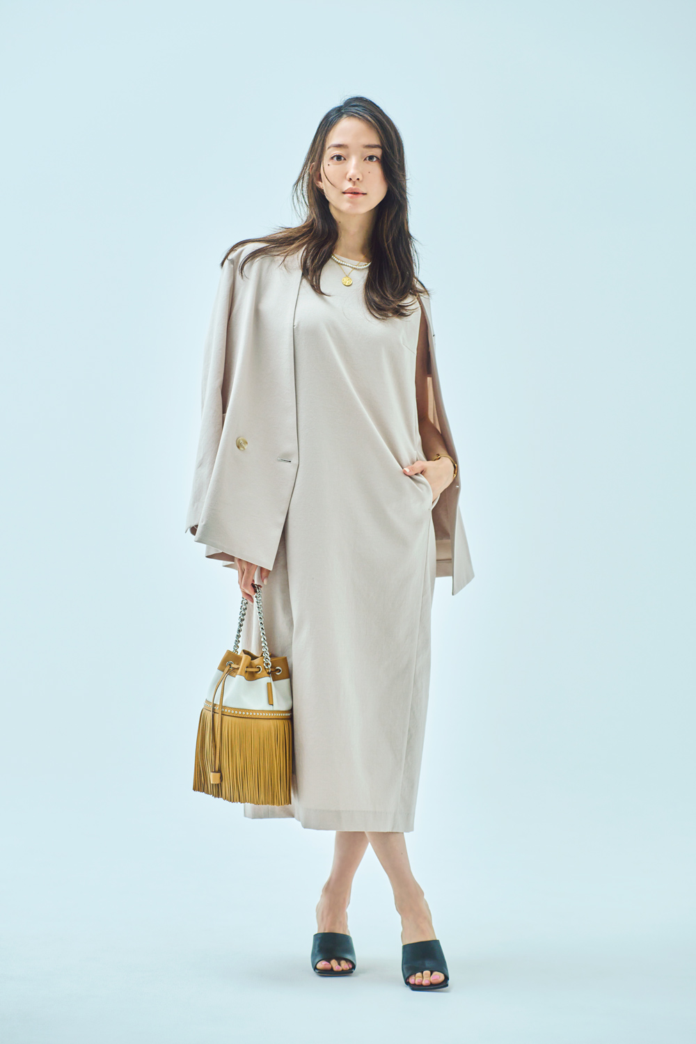 ワンピース¥23,870ジャケット¥22,990(ともにアンクレイヴ ホワイト/アンクレイヴ)バッグ¥151,800(J&M デヴィッドソン/J&M デヴィッドソン 青山店)サンダル¥53,900(ペリーコ/アマン)コインネックレス¥9,900(チビジュエルズ/チビジュエルズ・ジャパン)2連ネックレス¥25,850(ジゼルベー/ZUTTOHOLIC)時計¥14,190(クルース/HIROB ルミネ新宿店)