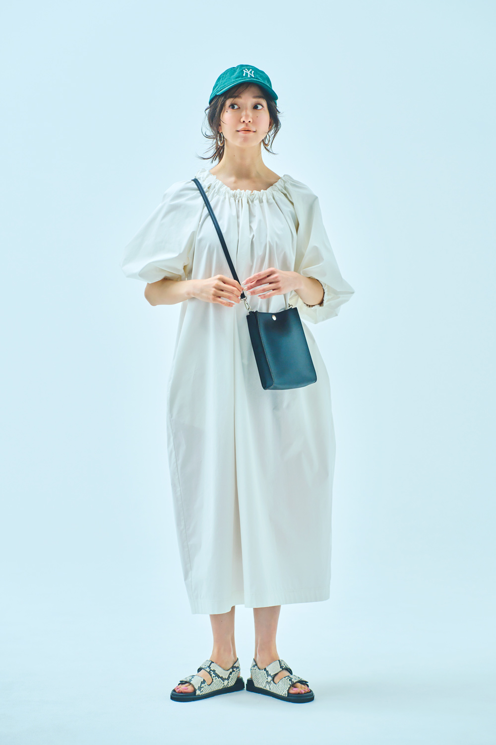 ワンピース¥11,550(Mila Owen/Mila Owen ルミネ新宿2店)バッグ¥3,630(カシュカシュ/アンビリオン)サンダル¥29,700(ペリーコ サニー/アマン)キャップ¥4,180(ニューエラ)ピアス¥5,250(アビステ)