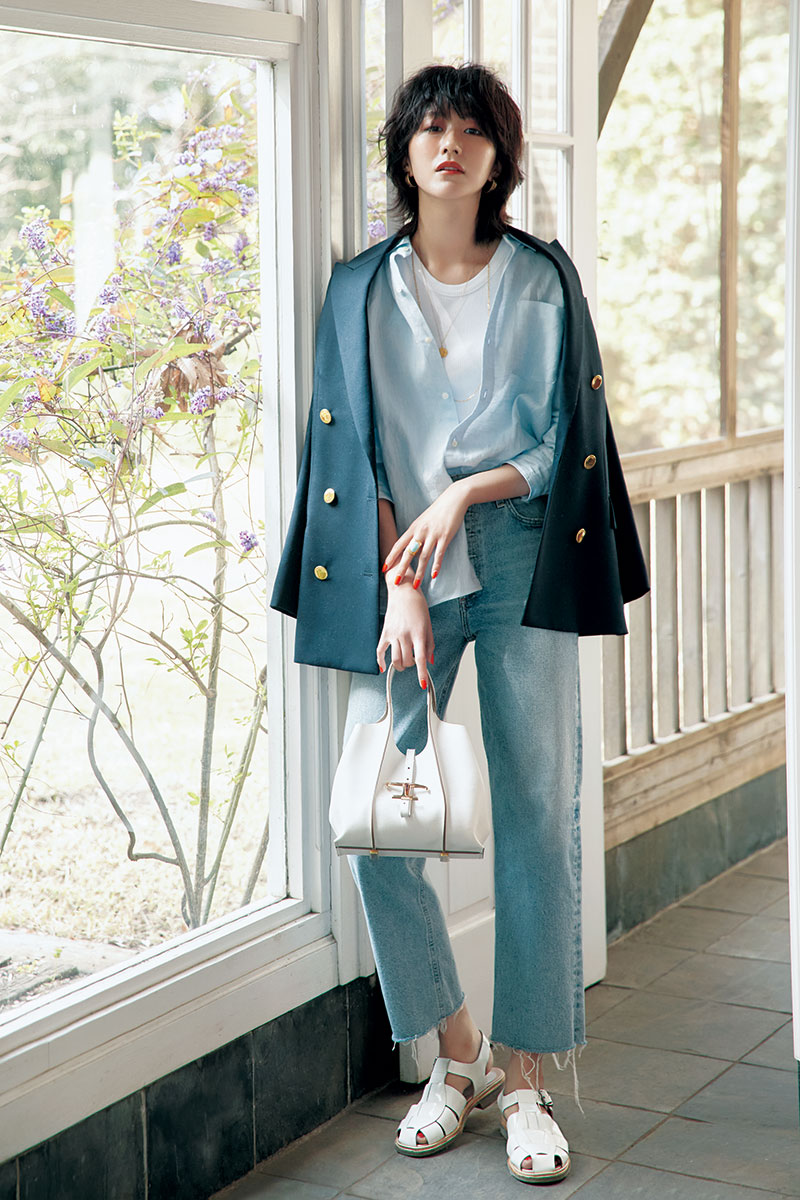 ジャケット×デニムの足元にもしっくり。ベーシックさをキープしながら抜け感をプラスしてくれます。シューズ¥41,800(パラブーツ青山店)ジャケット¥110,000(マディソンブルー/エストネーション)シャツ¥26,400(GALERIE VIE/GALERIE VIE丸の内店)タンクトップ¥12,100〈エー・ゴールド・イー〉パンツ¥36,300〈シチズンズ・オブ・ヒューマニティ〉(ともにシチズンズ・オブ・ヒューマニティ)ピアス¥8,800(ワンエーアールバイウノアエレ/ウノアエレ ジャパン)コインネックレス¥19,800チェーンネックレス¥22,000リング¥64,800(すべてマリハ)バッグ¥185,900(トッズ/トッズ・ジャパン)