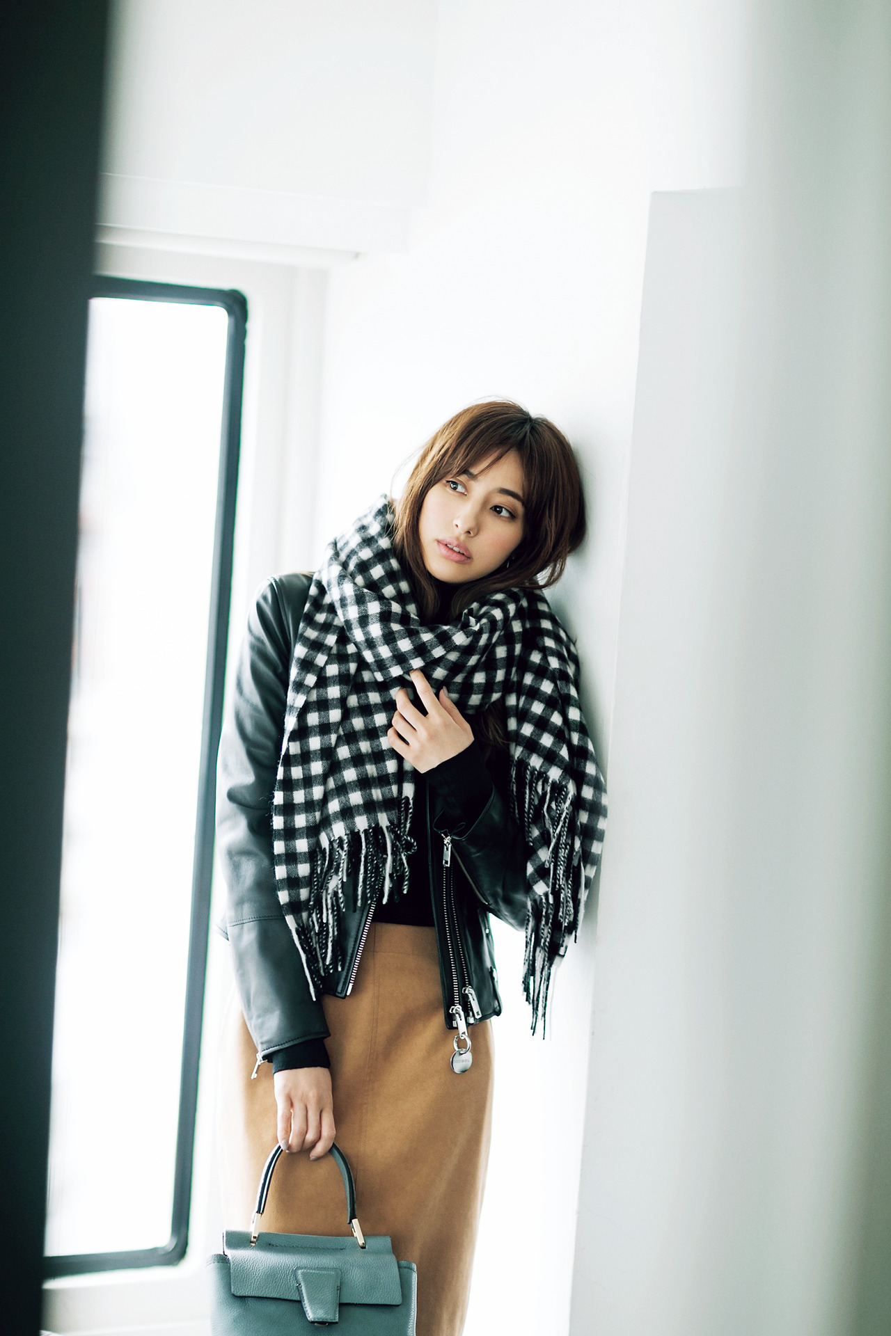 使い勝手のよいモノトーン柄。ストール¥21,000(アソース メレ×デミルクス ビームス/ビームス ハウス 丸の内)ライダースジャケット¥125,000(ディーゼル/ディーゼル ジャパン)ニット¥20,000(RJUBILEE/ショールーム セッション)スカート¥17,000(ユナイテッドアローズ/ユナイテッドアローズ 六本木ヒルズ店)バッグ¥47,000(ジャンニ キアリーニ/ジャンニ キアリーニ 銀座店)
