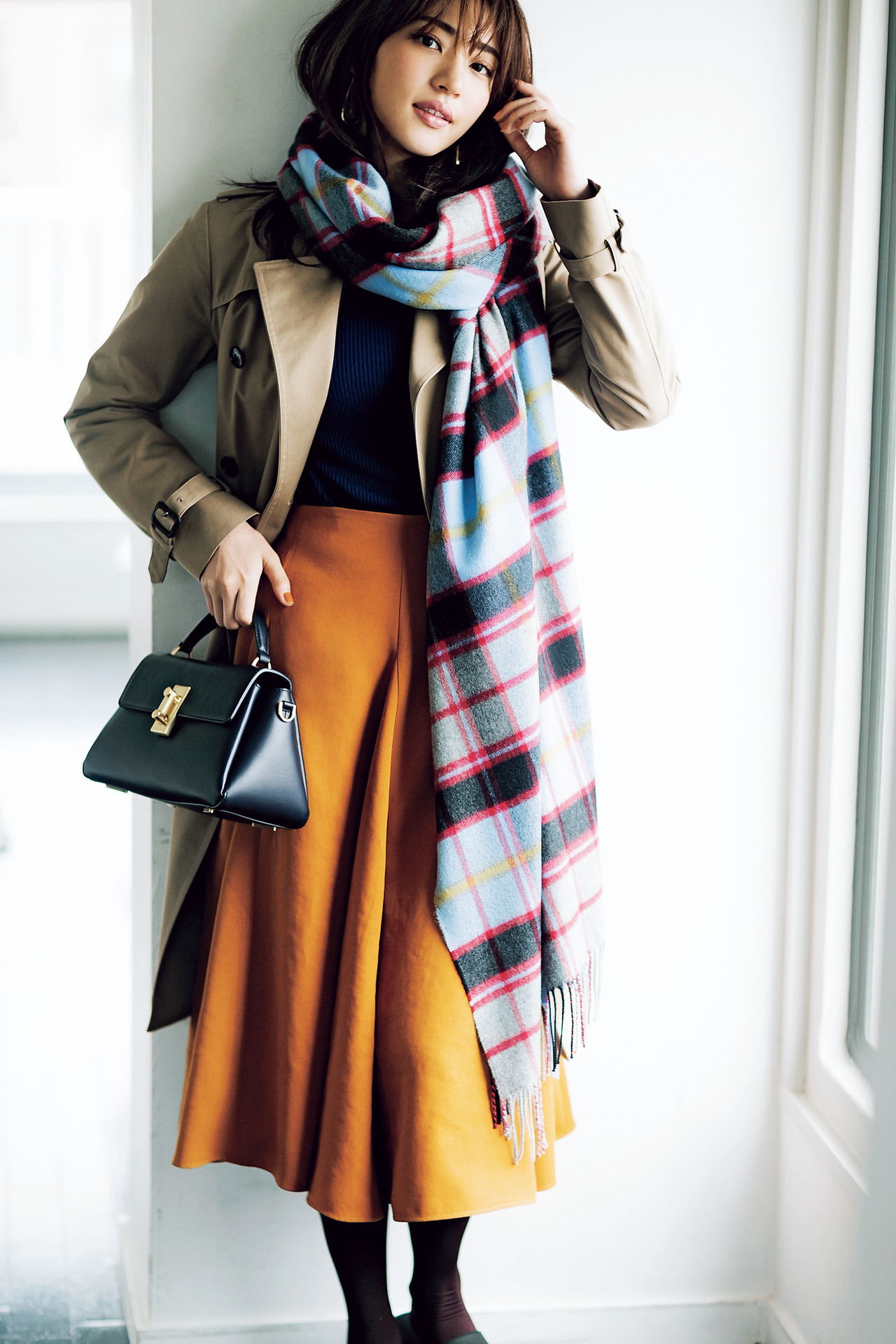トレンドのチェック柄を活かして、いつものスタイリングをオシャレにシフト。カラースカートと明るいチェック柄を可愛くリンクさせて。ストール¥62,000(ジョンストンズ/リーミルズ エージェンシー)トレンチコート¥75,000(ハイク/ボウルズ)ニット¥18,000(NATURALBEAUTY)スカート¥18,000(デミルクス ビームス/ビームス ハウス丸の内)バッグ¥43,500(フリン/CPR TOKYO)タイツ/私物