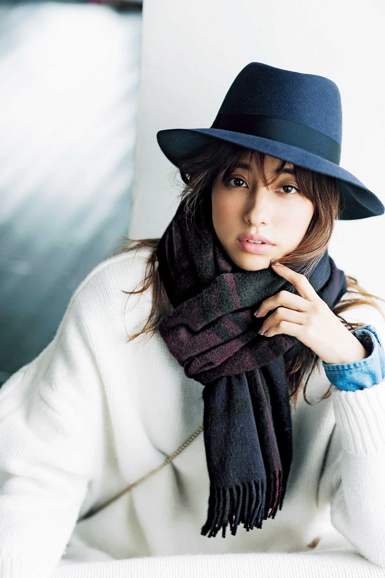 大判ストールで巻くことで、トレンド感のある仕上がりに! ストール¥52,000(ジョシュア エリス/グリニッジ ショールーム)ワンピース¥55,000(ハイク/ボウルズ)シャツ¥10,000(ラングラー/シティショップ)ニットレギンス¥9,000(トラディショナル ウェザーウェア/トラディショナル ウェザーウェア青山ウィメンズ店)ハット¥34,000(ロック&コー/スピック&スパンルミネ有楽町店)バッグ¥37,000(FURLA/FURLA JAPAN)