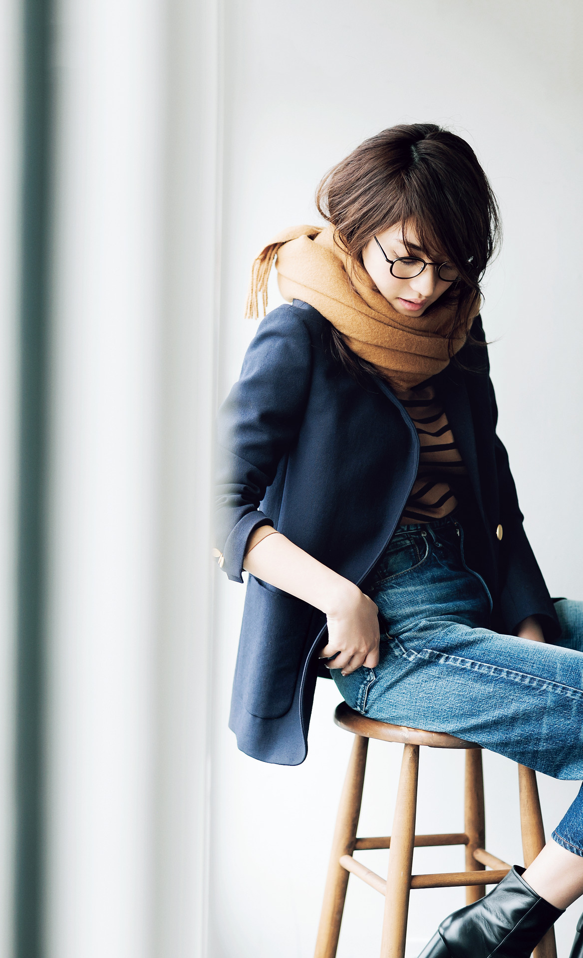 定番デニムスタイルこそ、ストールの巻き方にこだわって新鮮に。ストール¥14,000(GLENPRINCE/ナノ・ユニバースカスタマーサービス)ジャケット¥45,000(ユナイテッドアローズ/ユナイテッドアローズ六本木ヒルズ店)カットソー¥12,800(トラディショナル ウェザーウェア/トラディショナル ウェザーウェア 青山ウィメンズ店)シューズ¥69,000(ペリーコ/アマン)メガネ¥38,000(ハリー ラリーズ/ファブ)