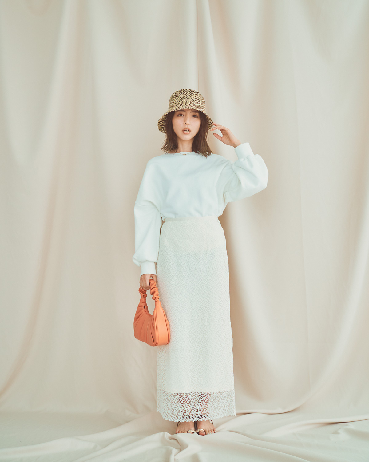 スウェット¥6,930(AKTE)スカート¥7,700(レプシィム/アダストリア)帽子¥14,300(ラ メソン ドリリス/シップス インフォメーションセンター)バッグ¥12,100(ジェーダブリュー ペイ/オデット エ オディール 新宿店)サンダル¥35,700(イル サンダル オブ カプリ/アマン)ネックレス¥13,200(オクト/フォーティーン ショールーム)
